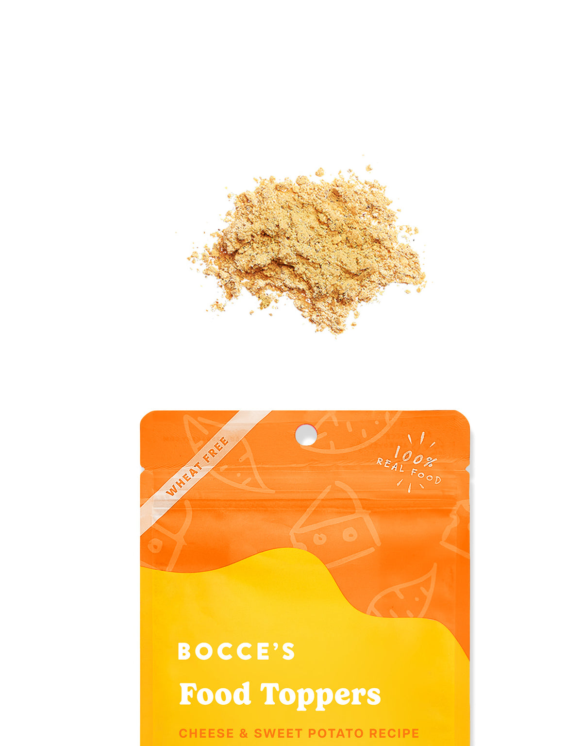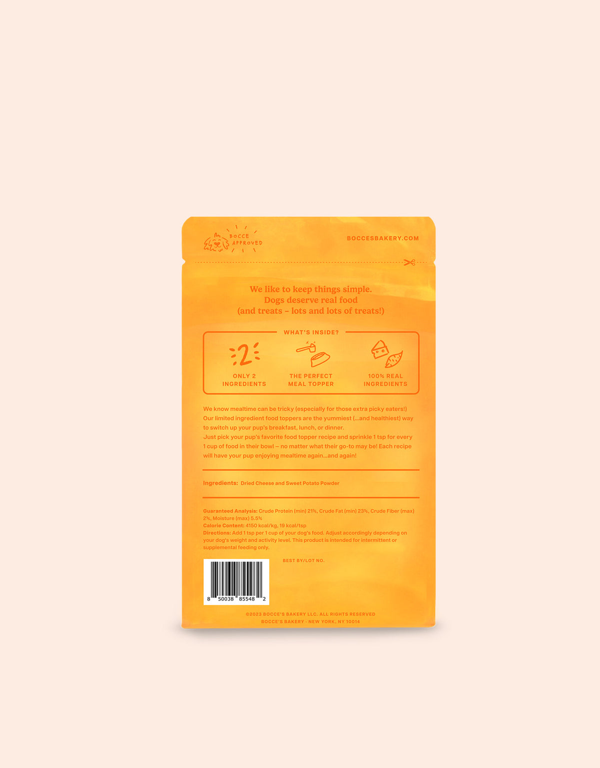 Enhance your dog's meals with Bocce's Bakery Cheese & Sweet Potato Food Topper. This simple, nutritious topper, made with just dried cheese and sweet potato powder, adds a burst of flavor and nutrition to any meal. It's wheat-free, baked in the USA, and perfect for picky eaters.