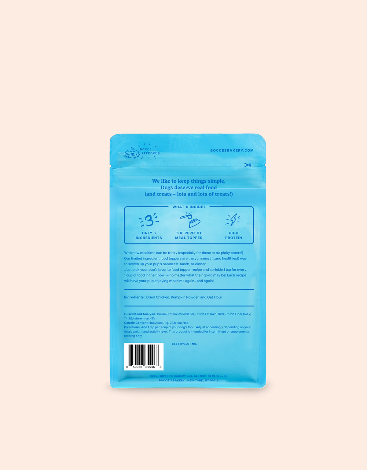 Enhance your dog's meals with Bocce's Bakery Chicken & Pumpkin Food Topper. Ideal for picky eaters, this delicious topper is made with just three ingredients: dried chicken, pumpkin powder, and oat flour. Wheat-free and baked in the USA, it adds nutrition and flavor to any meal.