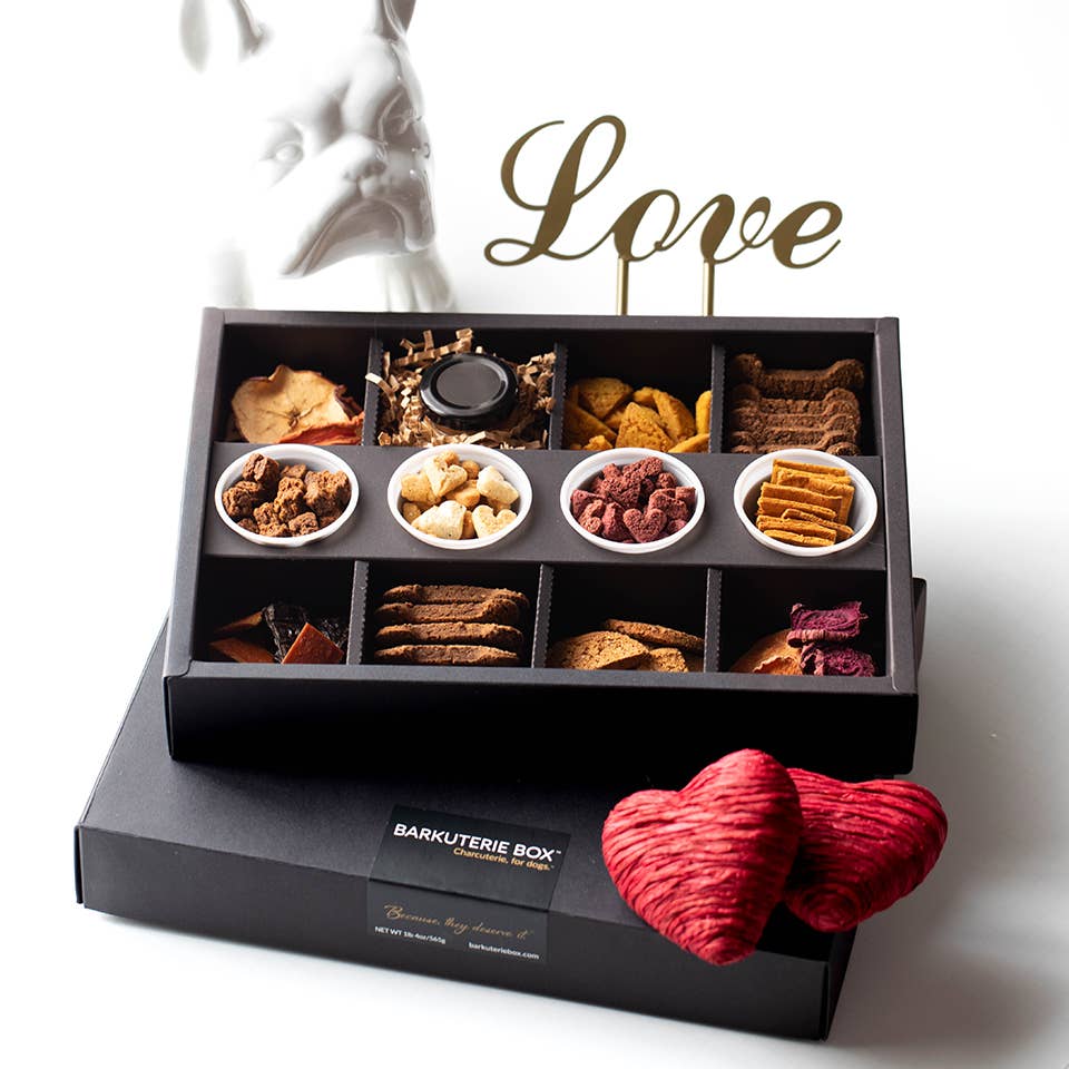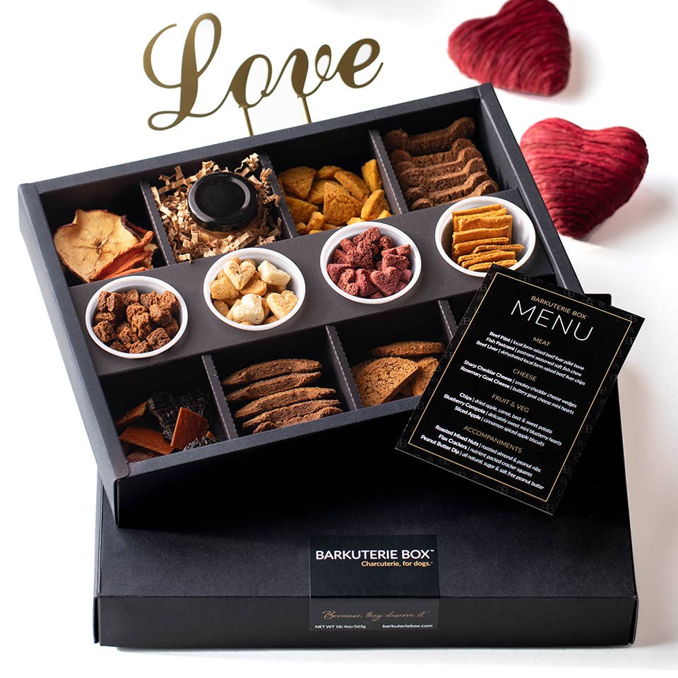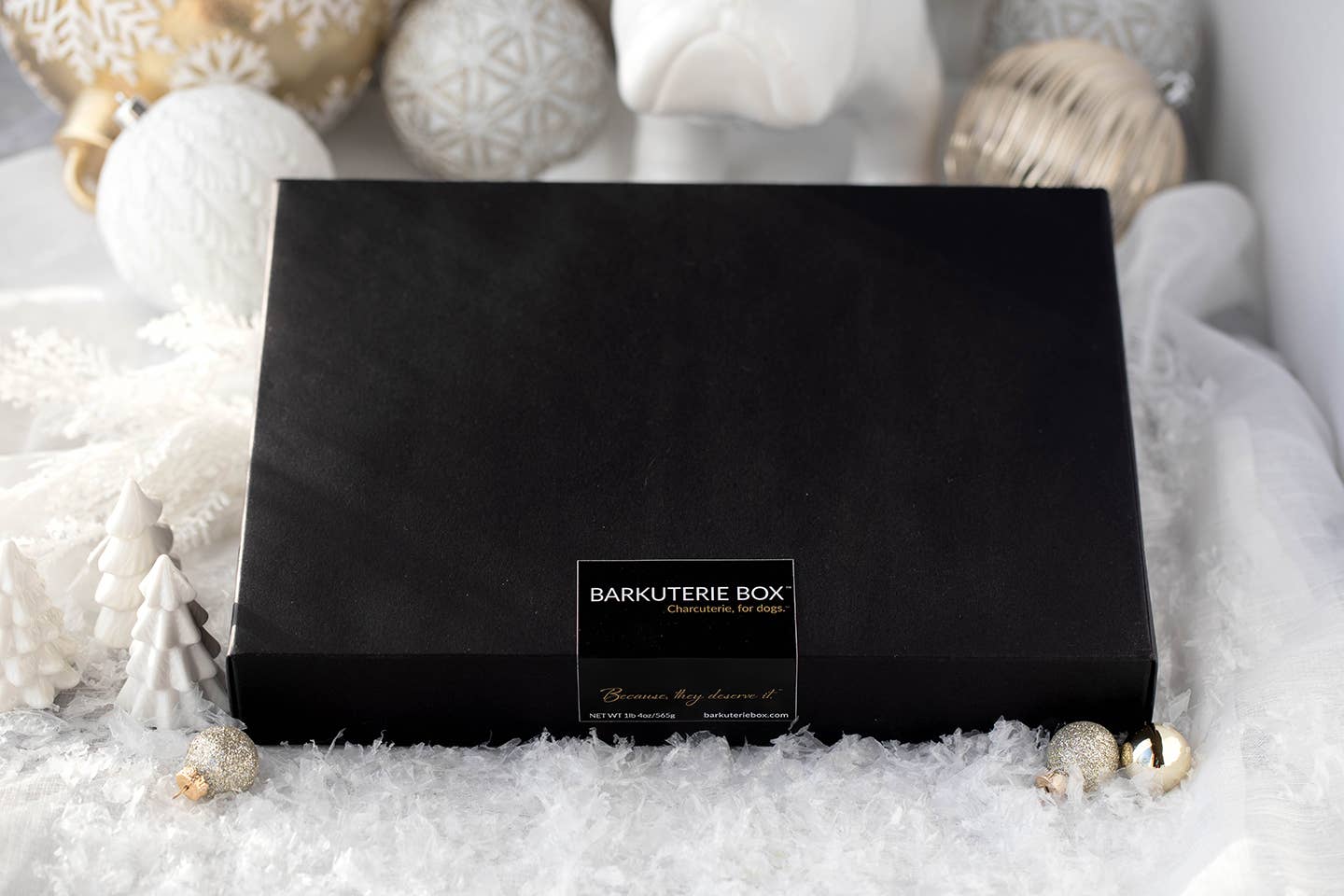 The Charcuterie Box, also known as a Barkuterie Box, is inspired by traditional charcuterie boards enjoyed in fine restaurants. With all-natural dog treats featuring a spread of meats, cheeses, fruits, nuts, and vegetables, this box is created especially for good boys and girls.