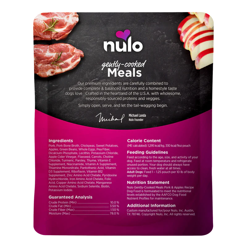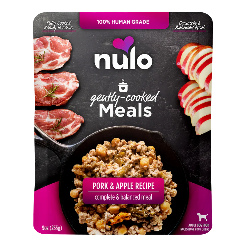 Home-cooking a complete and balanced meal for your dog can be tricky. With Nulo’s Gently-Cooked Meals, you can give your dog that homestyle taste, in a completely ready-to-serve, no-mess pouch. Made by gently-cooking protein-rich pork with diced sweet potatoes, apples, green beans, and chickpeas in a savory bone broth, this minimally processed meal provides complete and balanced nutrition with ingredients you can recognize. Simply open, serve and let the tail-wagging begin!