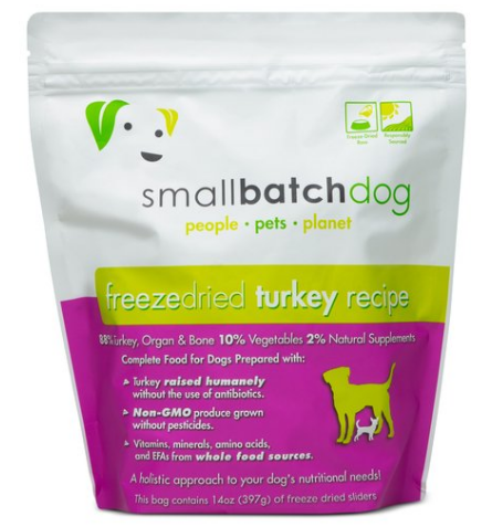 Complete and Balanced- Smallbatch Dog Freezedried turkey Recipe is formulated to meet the nutritional levels established by the AAFCO Dog Food Nutrient Profiles for all life stages excluding growth of large size dogs.