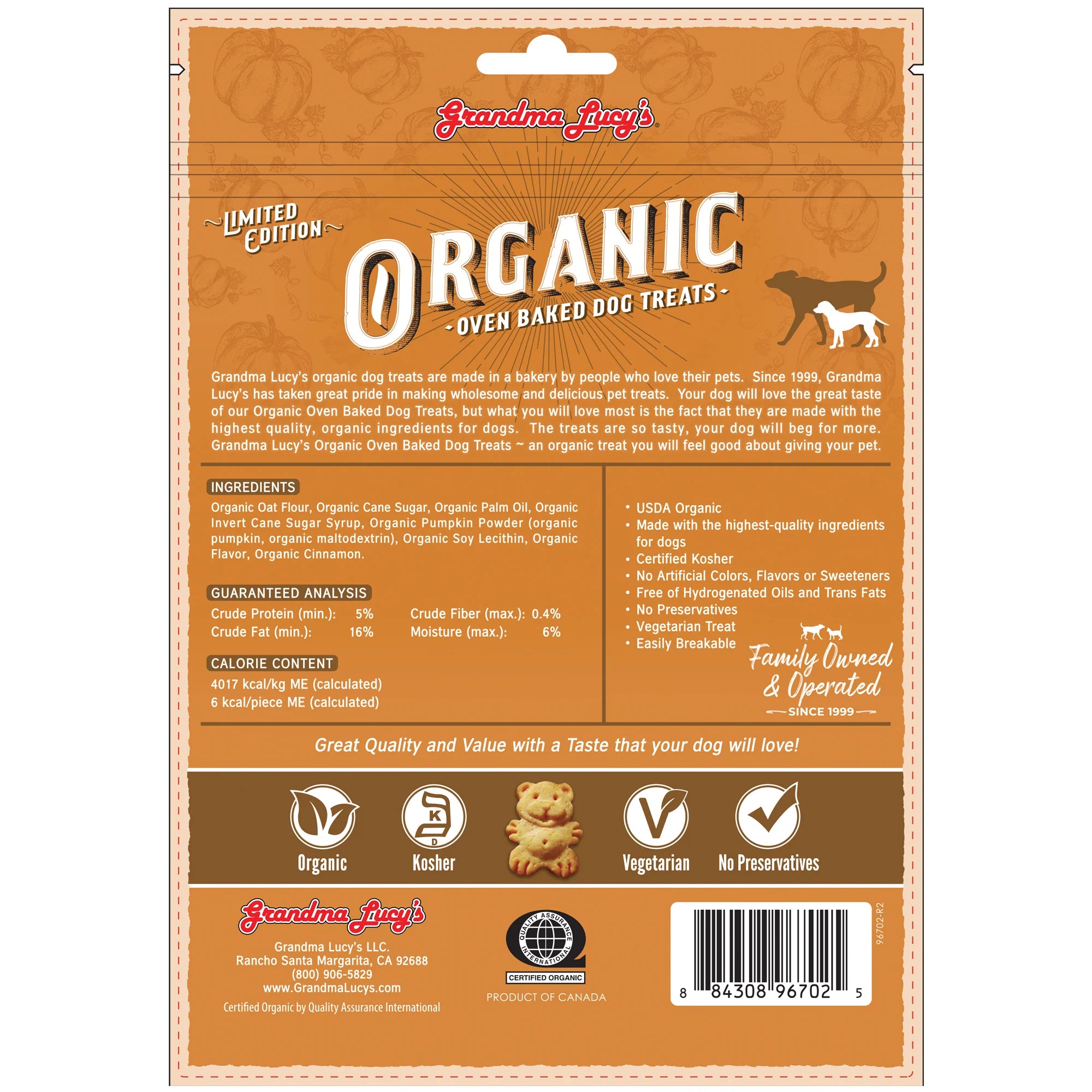Organic Oat Flour, Organic Cane Sugar, Organic Palm Oil, Organic Invert Cane Sugar Syrup, Organic Pumpkin Powder, (Organic Pumpkin, Organic Maltodextrin, Organic Sunflower Oil, De-Oiled Sunflower Lecithin) Organic Soy Lecithin, Organic Cinnamon.