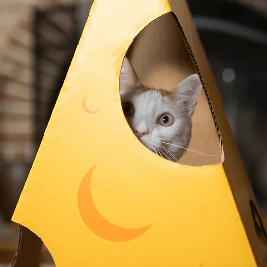 Does your cat love cardboard boxes? Are you living with dirty, ugly Amazon boxes in your home? Are you worried about your cat chewing or licking boxes that might not be safe? Our Monster Cheese Wedge cardboard cat house is clean, cat safe, fun and attractive! The Monster Cheese Wedge is a great cardboard box toy for box-loving cats. It's a wonderful piece of cat furniture or a cat cave for your cat to climb into and onto.