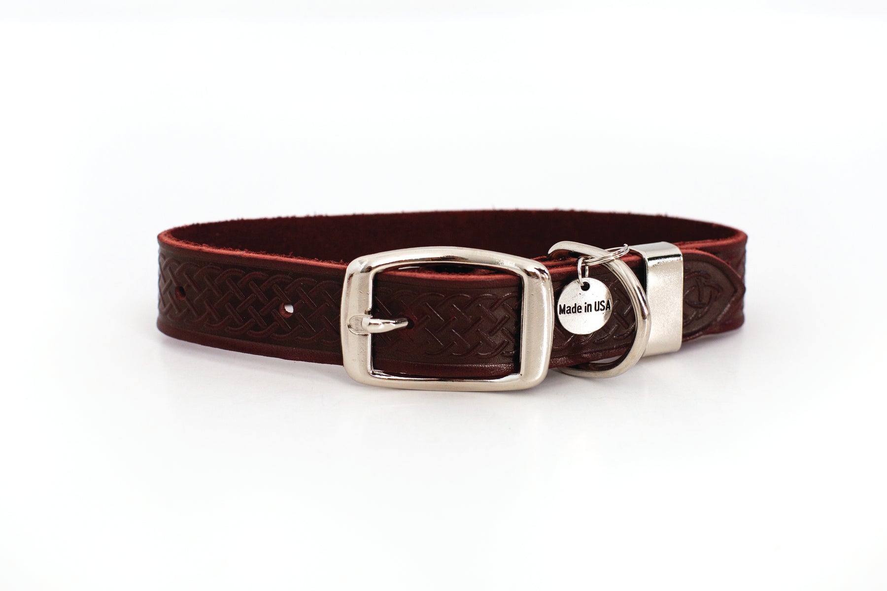 Exquisitely crafted with fine European steel and American leather, the Euro Dog Celtic Style Luxury Leather Dog Collar embodies centuries of European tradition in a stylish accessory for your pet. Available in a variety of rich colors and sizes, this collar is designed for both beauty and durability.