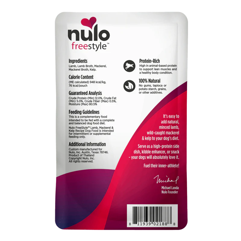 Nulo’s FreeStyle Lamb, Mackerel, & Kelp in Broth Dog Food Topper makes an excellent meal enhancer, side dish, or snack. This delectable recipe combines real lamb and mackerel along with nutritious kelp in a savory broth blend, loaded with lean protein to support healthy muscle. Made without any grain, soy or corn and zero artificial flavors or preservatives, this recipe is as simple as it is delicious.