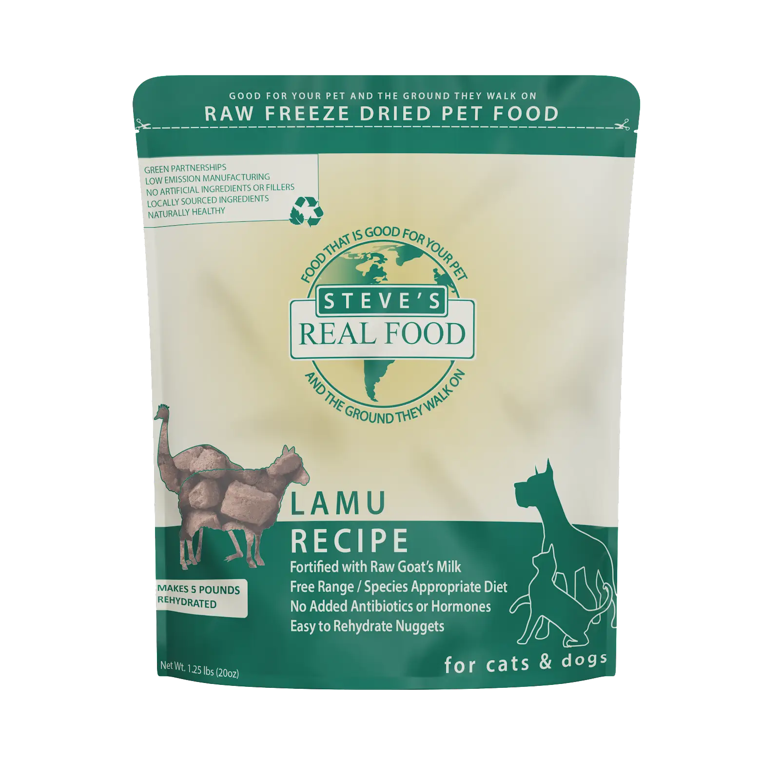 Lamu: Lamb, Emu, Organic Broccoli, Organic Carrots, Organic Squash, Organic Apples, Organic Blueberries, Organic Dried Kelp, Salmon Oil.