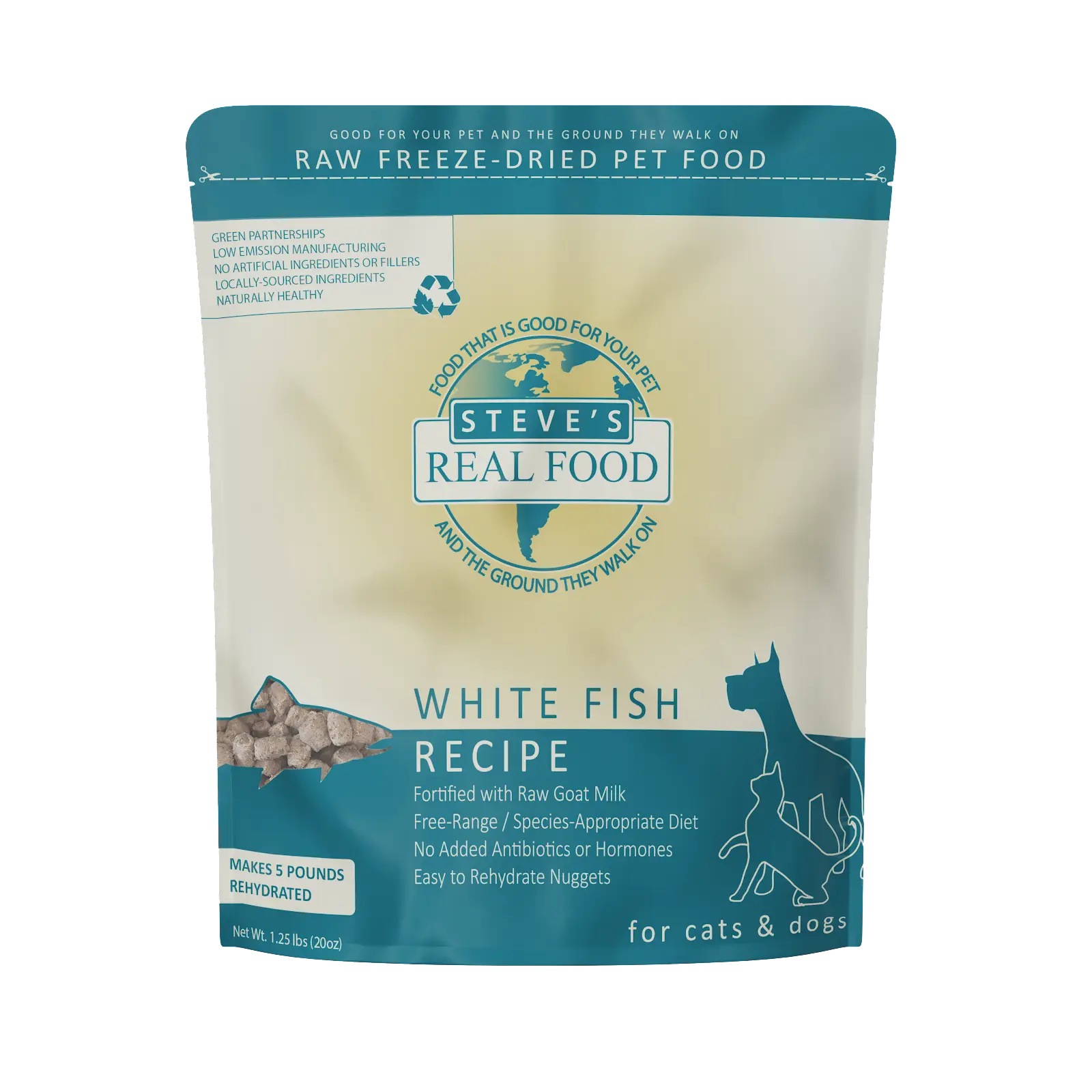 White Fish: White Fish, Organic Broccoli, Organic Carrots, Organic Squash, Organic Apples, Organic Blueberries, Organic Dried Kelp, Salmon Oil.