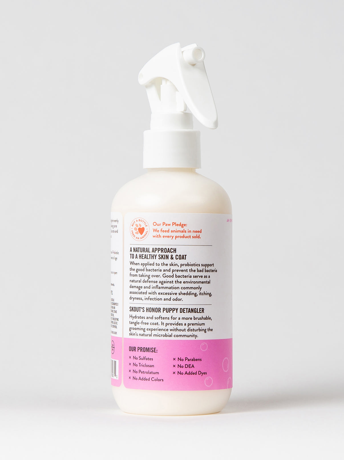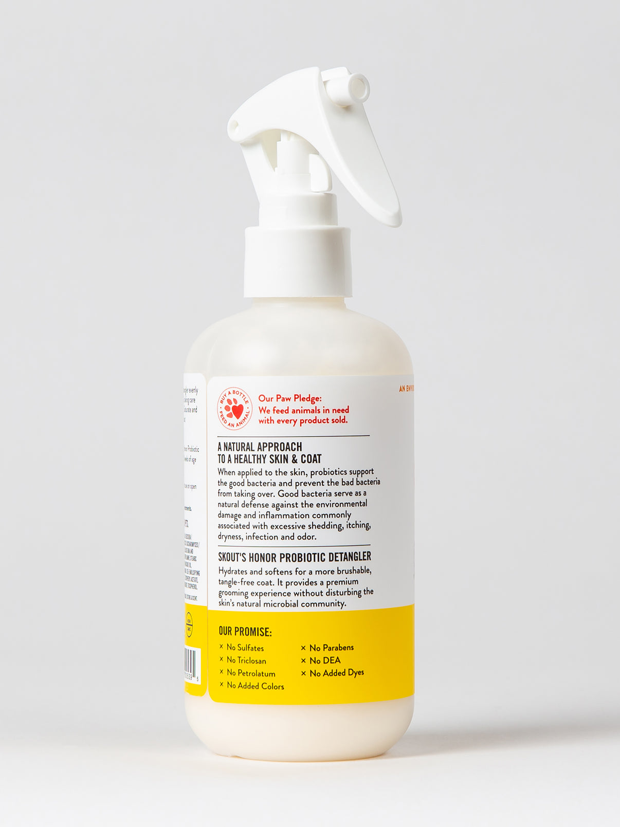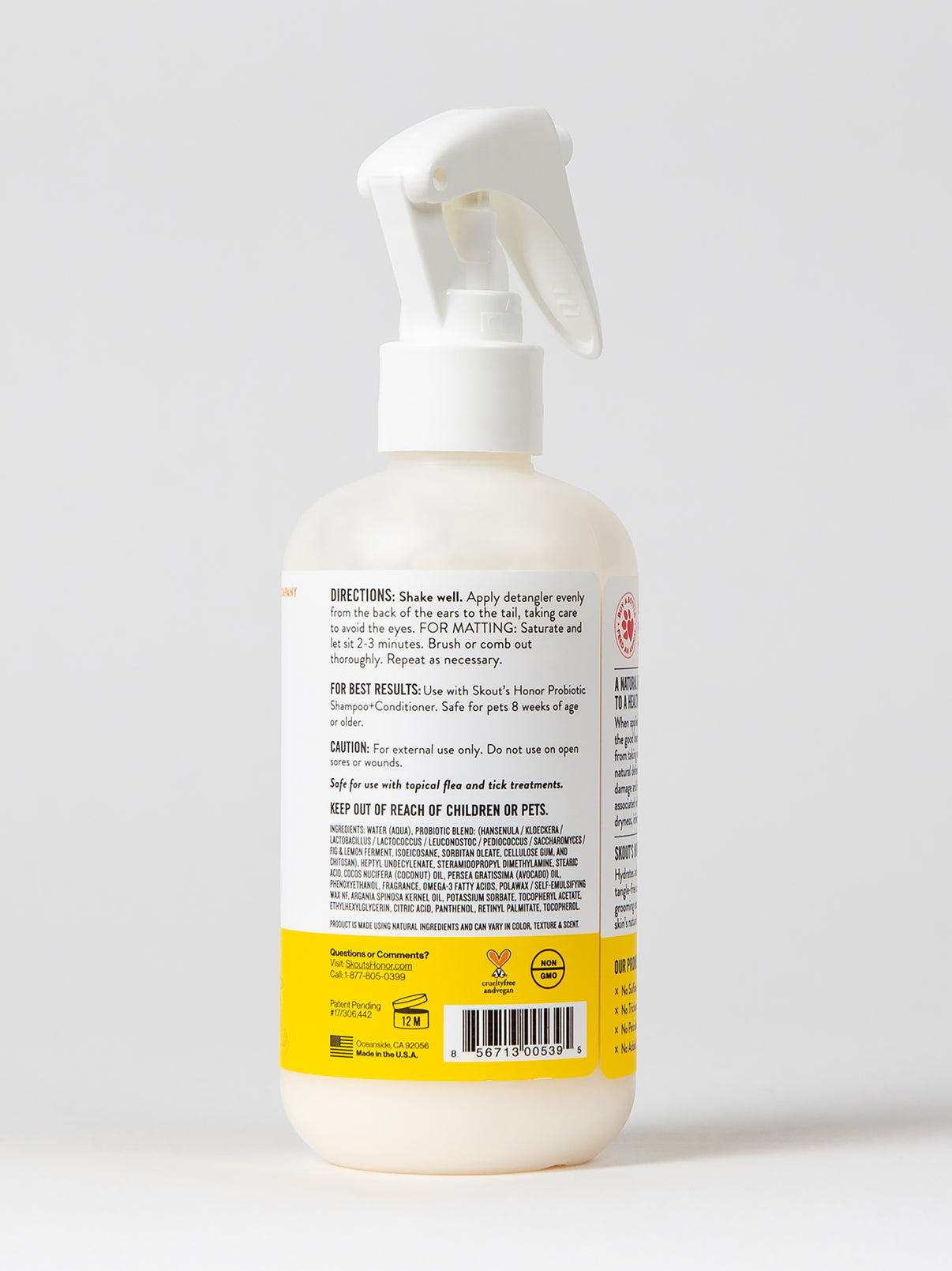 Keep your pet's coat smooth and tangle-free with Skout's Honor Probiotic Detangler. This daily-use detangling spray hydrates and softens the coat while supporting a healthy skin microbiome. Ideal for pets with matted and tangled coats, it is safe for long-haired pets and provides a boost of topical probiotics to defend against common skin issues.