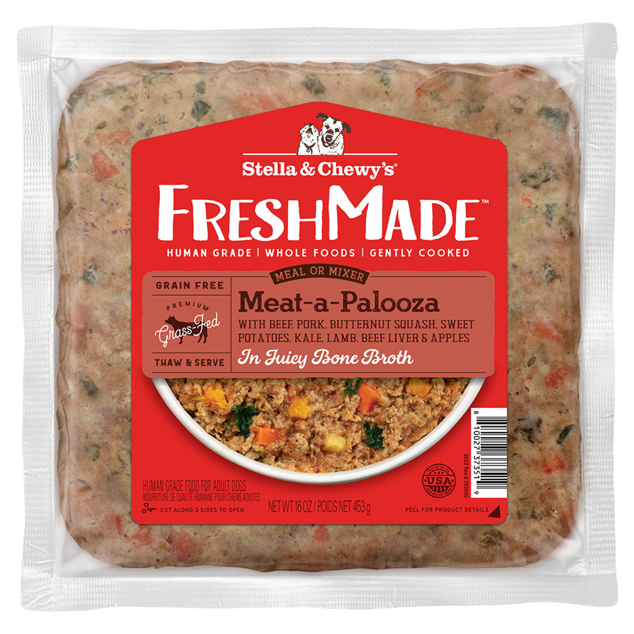 Feed your dog a feast of real, gently cooked nutrition with Stella & Chewy’s FreshMade Meat‑a‑Palooza. This grain‑, legume‑, and poultry‑free recipe features 100% human-grade whole foods and a rich beef bone broth base. Packed with 60% meats & organs and enhanced with superfoods, it delivers savory flavor and nourishment in every bite—perfect as a complete meal or a tasty topper.