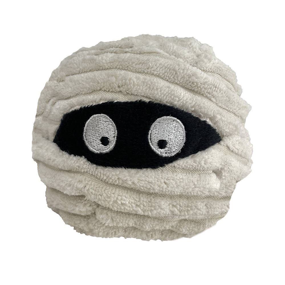 * 4" wide ball-shaped twin pack dog toy shaped like a cute bat and mummy heads.