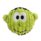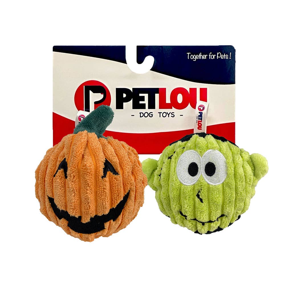 * 4" wide ball-shaped twin pack dog toy shaped like a cute pumpkin and Frankenstein's heads.