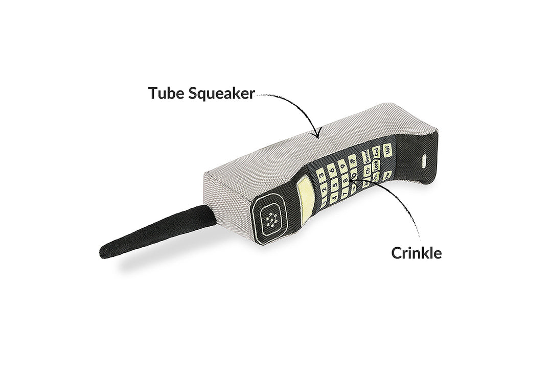Bring a slice of the 90s to your dog's toy collection with the nostalgic 90s Are Calling toy from P.L.A.Y. This durable, plush toy is designed to look like a classic block cellphone, complete with a squeaker for engaging play. It's made with eco-friendly materials, including recycled plastic bottle filler, and is both machine washable and dryer friendly. Perfect for dogs who love a bit of throwback fun.