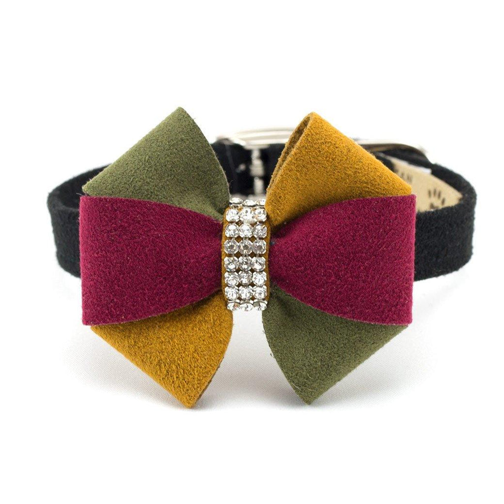 This collar has a premium look and feel, while being easy for you to maintain. Made from Ultrasuede® fabric with the soft texture and feel of premium suede. Ultrasuede® offers the highest grade of durability, making this collar resistant to stains and discoloration, it is even machine washable! The Autumn Bow's rich colors fan out for a display of warm and inviting curves with rows of genuine Swarovski® crystals in the center. We recommend your dog should always be walked with a harness. Our collars are designed for ID tags, charms and for decoration, they are NOT designed for pulling dogs. Collar width is ½”. Manufactured in the USA