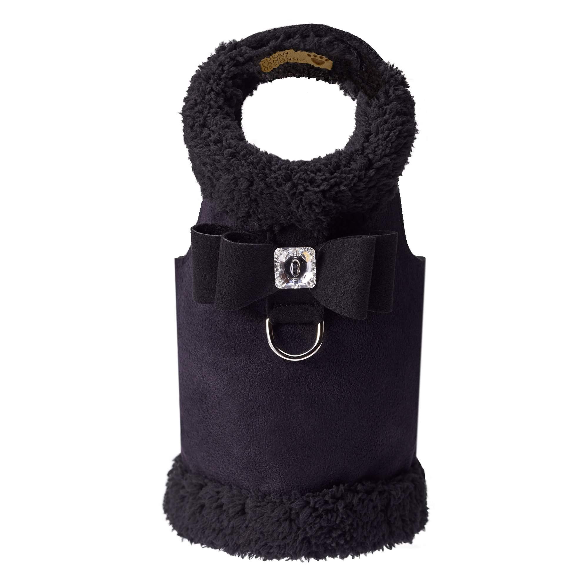 Our Bowzer Coat somehow has a manly feel to it, ideal for winter walks. Lined with soft chenille, and topped with a silver D ring, this is the perfect warm winter coat that can function like a harness. The neck and underbelly hook and loop closure allows for easy on and off action. The completely washable luxe suede stands the test of time. Made in the USA.