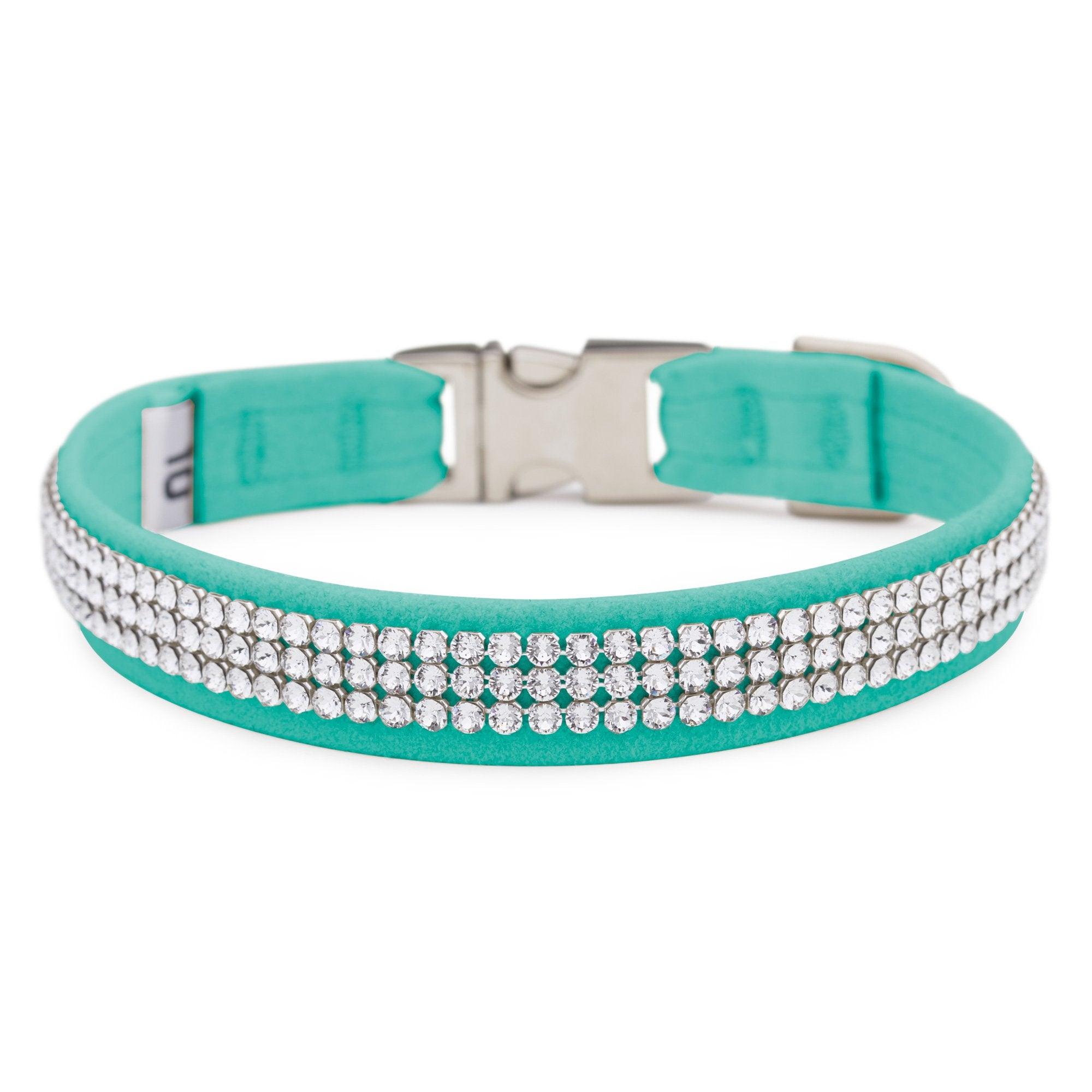 Comfortable for your dog, easy for you to maintain. With 3 rows of glistening Swarovski Crystals. In addition to that, the fabric gives you a wide range of colors – from soft pastels to vibrant hues. The Perfect Fit buckle allows for easy on and off action. Like all of our designs, it is made from genuine commercial upholstery grade Ultrasuede® fabric that we import from Japan. This soft, comfortable fabric is breathable, washable and colorfast. This collar is manufactured in the USA. We recommend your dog should always be walked with a harness. Our collars are designed for ID tags, charms and for decoration. They are not designed for pulling dogs.