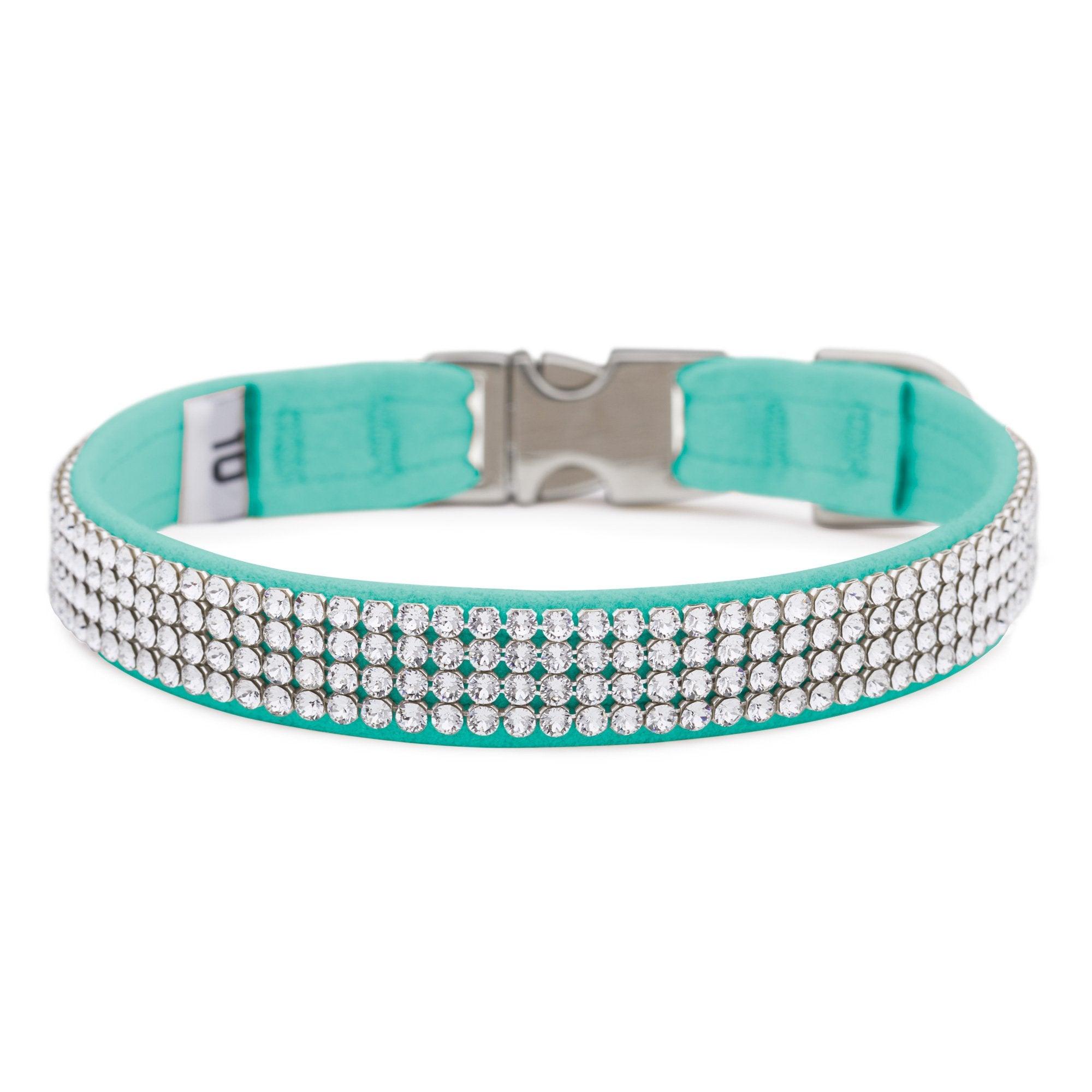The stunning 4 rows of Swarovski Giltmore crystals are sure to turn heads! Comfortable for your dog, easy for you to maintain. In addition to that, the fabric gives you a wide range of colors – from soft pastels to vibrant hues. Like all of our designs, this 1/2 inch collar is made from genuine commercial upholstery grade Ultrasuede® fabric that we import from Japan. This soft, comfortable fabric is breathable, washable and colorfast. This collar is manufactured in the USA. We recommend the dog should always be walked with a harness. Our collars are designed for ID tags, charms and for decoration. They are not designed for pulling dogs.