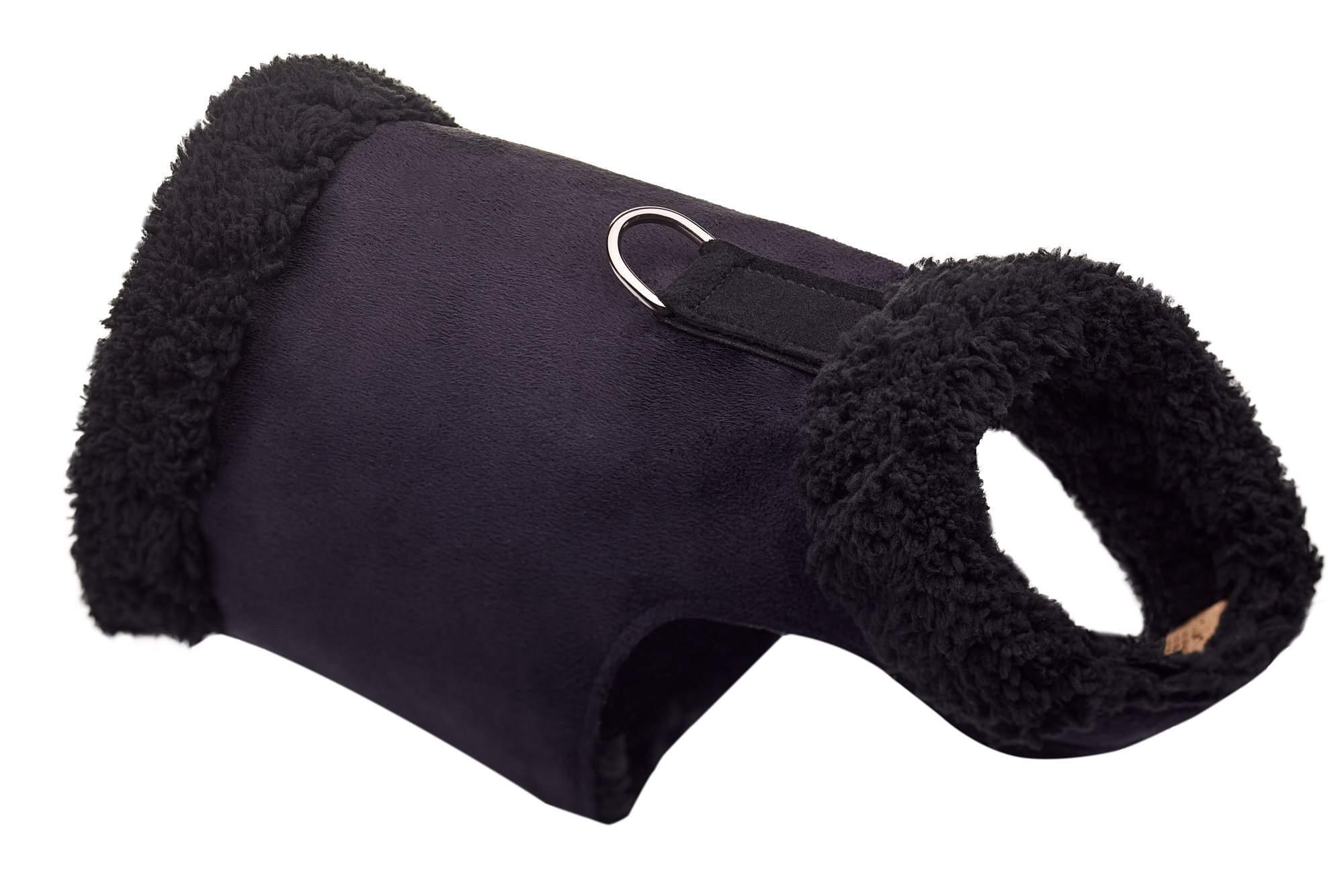 Our Bowzer Coat somehow has a manly feel to it, ideal for winter walks. Lined with soft chenille, and topped with a silver D ring, this is the perfect warm winter coat that can function like a harness. The neck and underbelly hook and loop closure allows for easy on and off action. The completely washable luxe suede stands the test of time. Made in the USA.