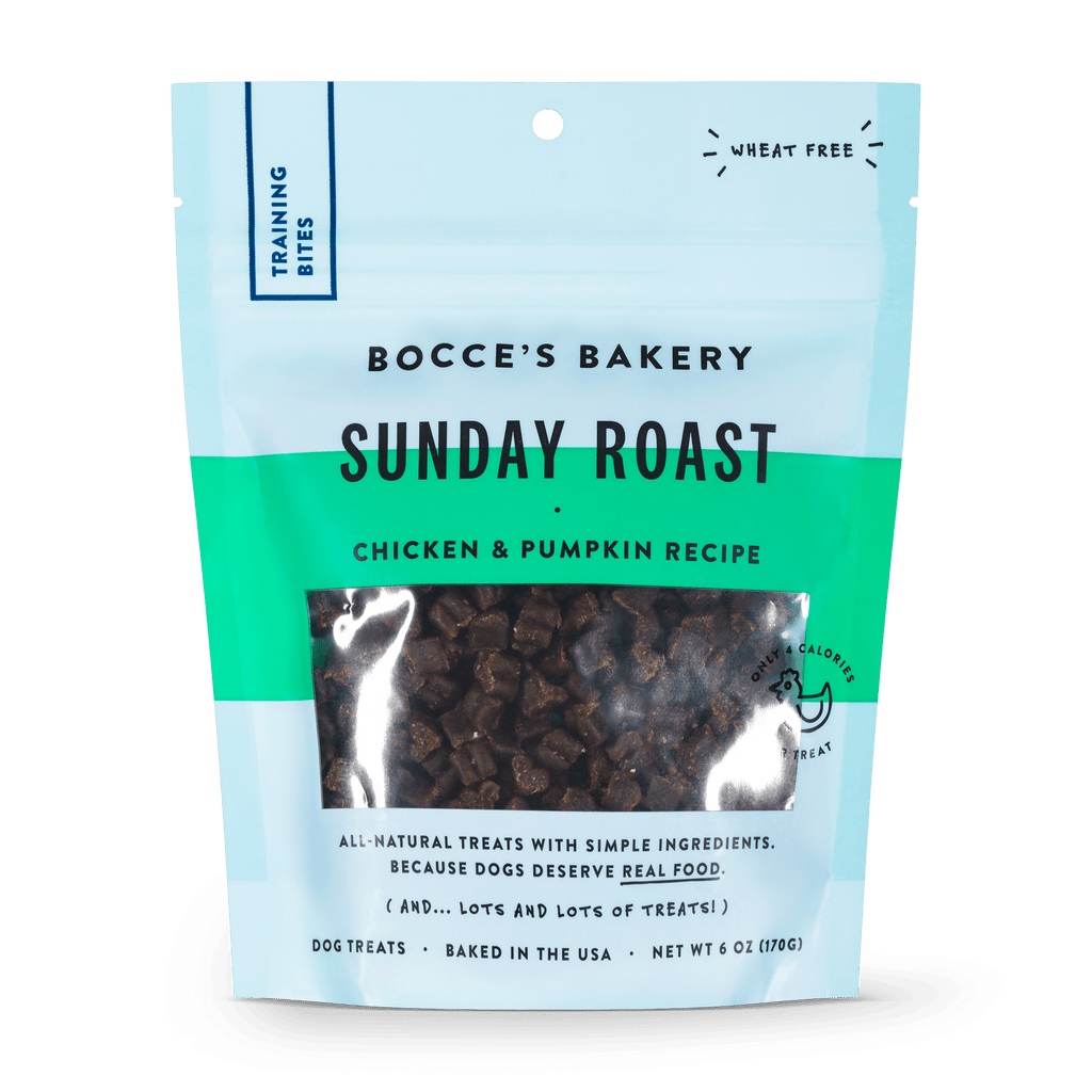 Whether training your pup or simply treating them, Bocce's Bakery Sunday Roast Dog Treats are perfect. Available in Soft & Chewy for a satisfying treat or as smaller Training treats for frequent rewards, both versions are crafted with chicken, pumpkin, and other wholesome ingredients. Enjoy these wheat-free, USA-made treats in any training or snacking scenario.
