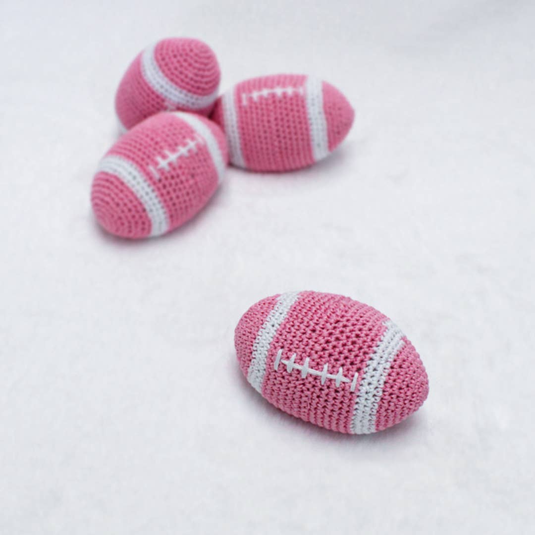 This cool crochet football dog toy by Hello Doggie contains an inside squeaker for loads of fun! Hand made with the finest cotton, this little dog toy is non-toxic and durable! Chewing on this toy will actually help to keep your dog's teeth clean and healthy! Measures approximately 4" long. Available in pink.