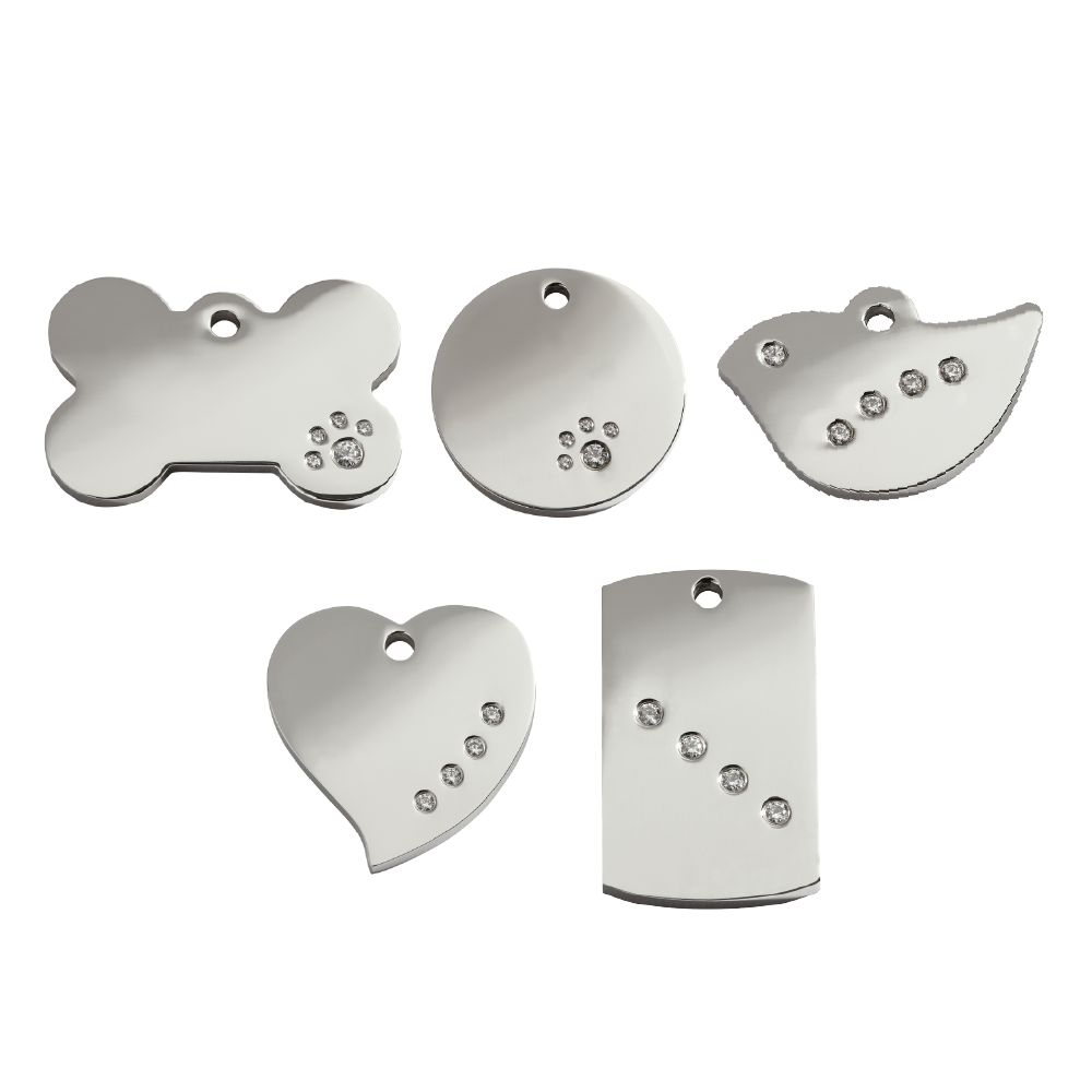 Add a touch of elegance to your pet's collar with the Red Dingo Diamante Pet ID Tags. Crafted from 3mm-thick mirror-polished stainless steel and adorned with cubic zirconia gemstones, these tags combine durability with sophisticated style.