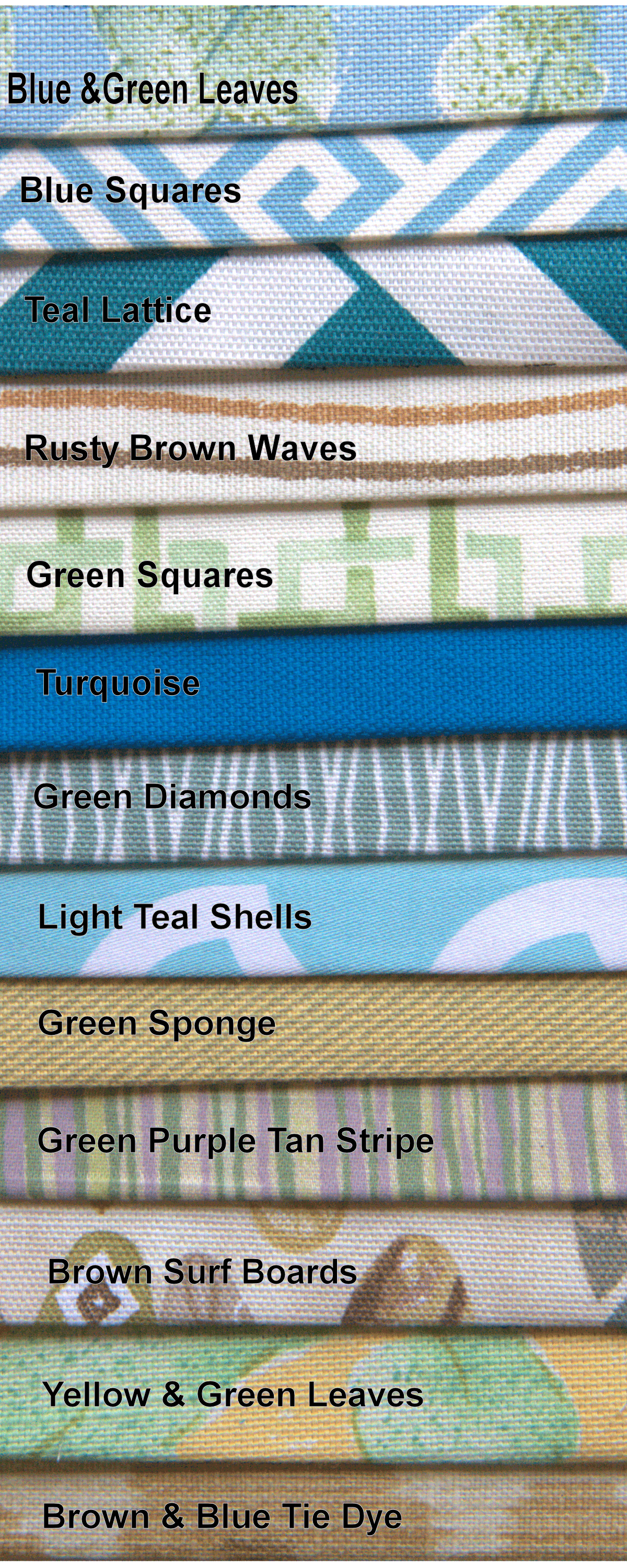 Colors: Blue & Brown Tie Dye, Blue & Yellow Leaves, Blue Squares, Brown Surf Boards, Green & Yellow Leaves, Green Diamonds, Green Sponge, Rusty Brown Waves, Teal Lattice, Teal Shells, Thin Purple Green Tan Stripe, Thin Tan Stripe, Turquoise