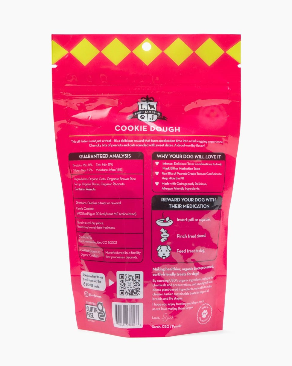 Our recipes are 100% preservative-free. We are plant-based meaning zero animal proteins. We never use allergy-triggering ingredients like corn, wheat, soy, or dairy. We only use real, whole organic ingredients -never anything artificial! Lord Jameson is using a texture confusion concept to help decrease the chance of your dog spitting out the pill. We leave real bits of ingredients such as peanuts in our dough to confuse the dog's palate leaving them unable to differentiate between pill or treat. A pill Hider Pouch contains a 30-day supply of treats. Advised by our team of vet consultants, we also include 6 BONUS treats designed to condition the dog to eat the treat without the pill before using for medication administration. The process of unloaded vs. loaded is designed to help decrease chance of dog spitting out pill. You can find out more by scanning the QR code on the back of the pouch.