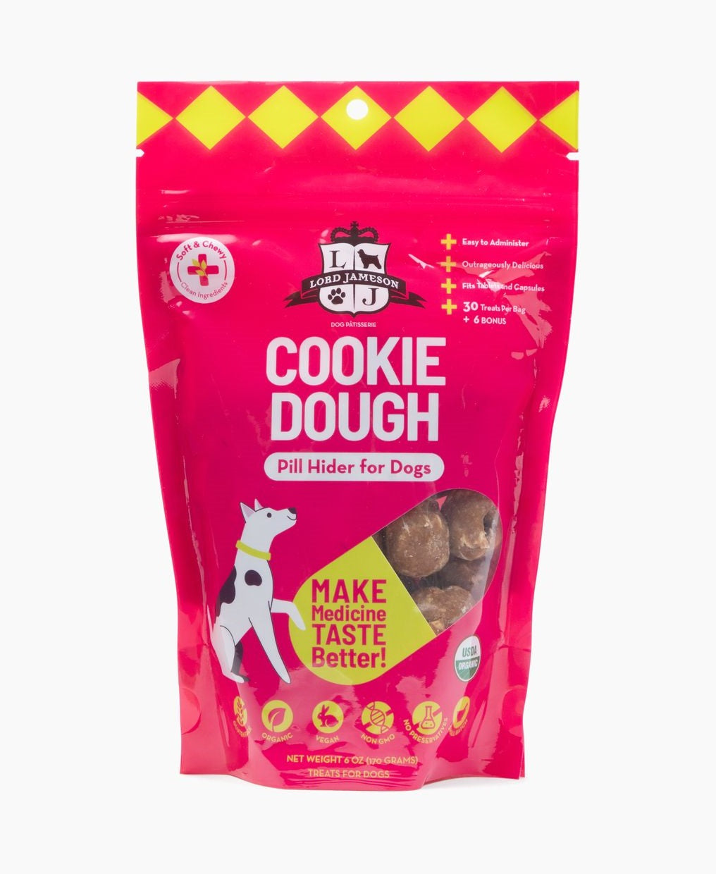 Make medicine taste better with our Cookie Dough flavored Pill Hider Dog Treat. Finally, a CLEAN way to make administering your dog's medications an easy and tail-wagging experience! Just stick the pill or capsule inside one of our pill hider treats, pinch the treat closed to form a soft moldable pill hider, and feed to your dog! Watch your dog's tail wag as they beg for more! Lord Jameson is thrilled to offer dog parents a CLEAN Pill Hider designed with exciting and robust flavors to mask the bitter taste of their dog's medication. Our Pill Hider recipes are great for dog's with or without allergies or sensitivities!