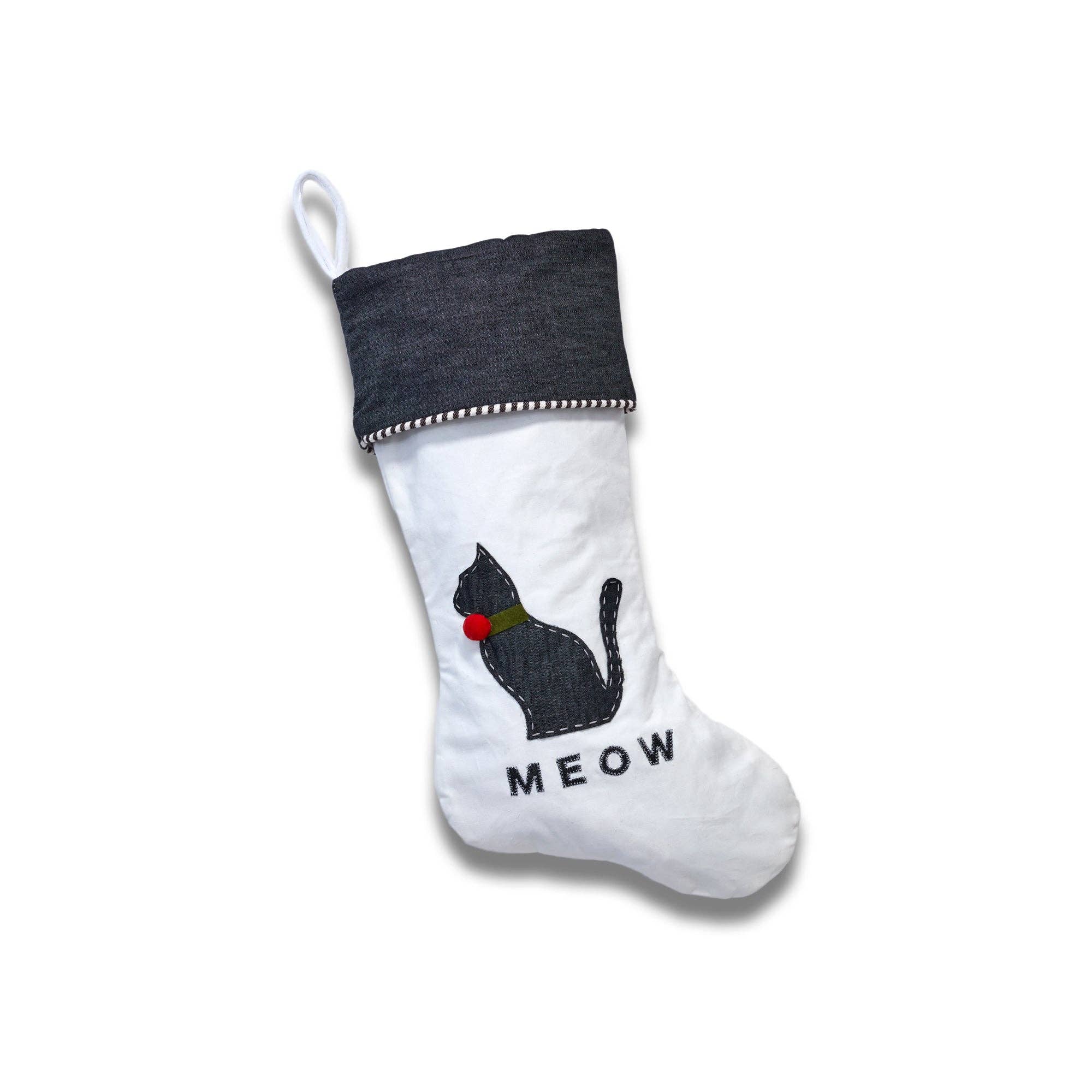 Bring a modern twist into your home this holiday season with the Our 'Meow' Stocking With Christmas Stocking. It’s the purrfect stocking addition for all the cat lovers. Made with a winter white canvas, dress denim, and cat applique with a green velvet collar and red pom-pom bell, this stocking is a sure way to give your holiday decor a nice refresh. Cat Christmas Stocking.