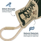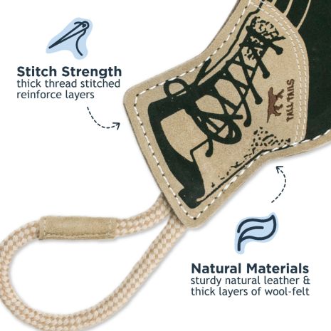The Tall Tails Natural Leather Boot Tug Dog Toy is a 16-inch interactive toy designed for medium to large dogs who enjoy games of fetch and tug-of-war. Crafted from sturdy buffalo hide and reinforced with natural wool-felt layers, this toy offers durability and engaging playtime.