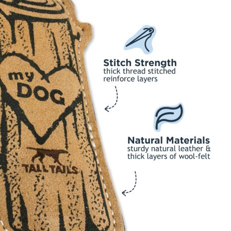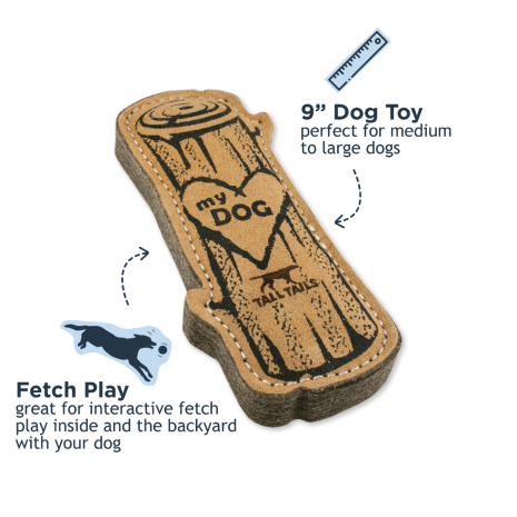 The Tall Tails Natural Leather "Love My Dog" Log Toy is a 9-inch fetch toy designed for interactive play with medium to large dogs. Crafted from sturdy buffalo hide and reinforced layers of natural wool-felt, this toy is perfect for games of fetch and tug-of-war.