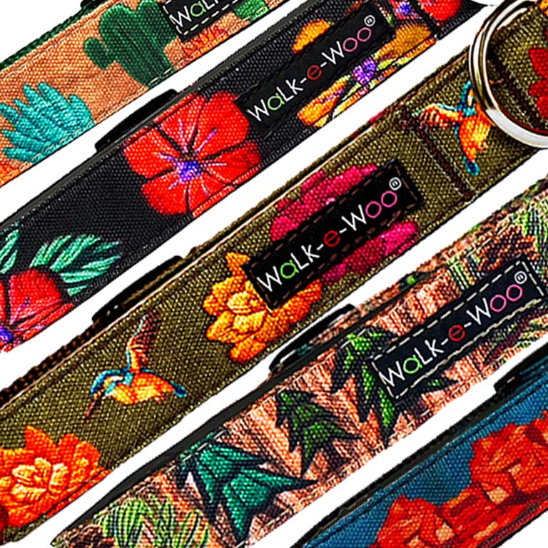 Backed by soft, strong, breathable nylon webbing, Walk-e-Woo's exclusive designs are printed on super-durable fabric that resists water and dirt.