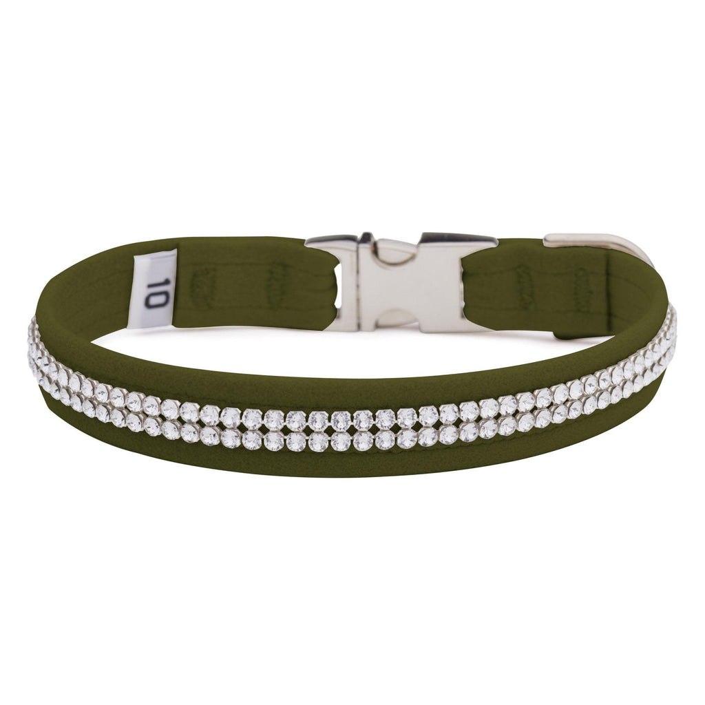 This collar has a premium look and feel, while being easy for you to maintain. Made from Ultrasuede® fabric with the soft texture and feel of premium suede. Ultrasuede® offers the highest grade of durability, making this collar resistant to stains and discoloration, it is even machine washable! This collar captures effortless convenience in fastening with a quick-release buckle, please note this feature has no adjustments so take care to make accurate measurements in finding the perfect fit for your dog. The lavish Giltmore rows shimmer and shine with genuine Swarovski Crystals®. We recommend your dog should always be walked with a harness. Our collars are designed for ID tags, charms and for decoration, they are NOT designed for pulling dogs. Collar width is ½”. Manufactured in the USA