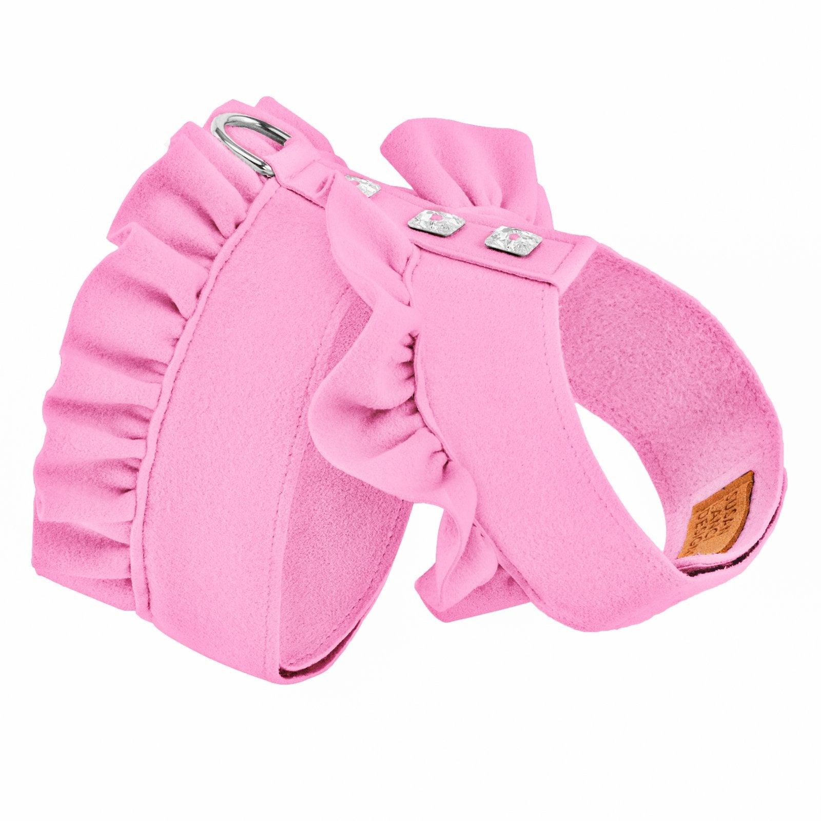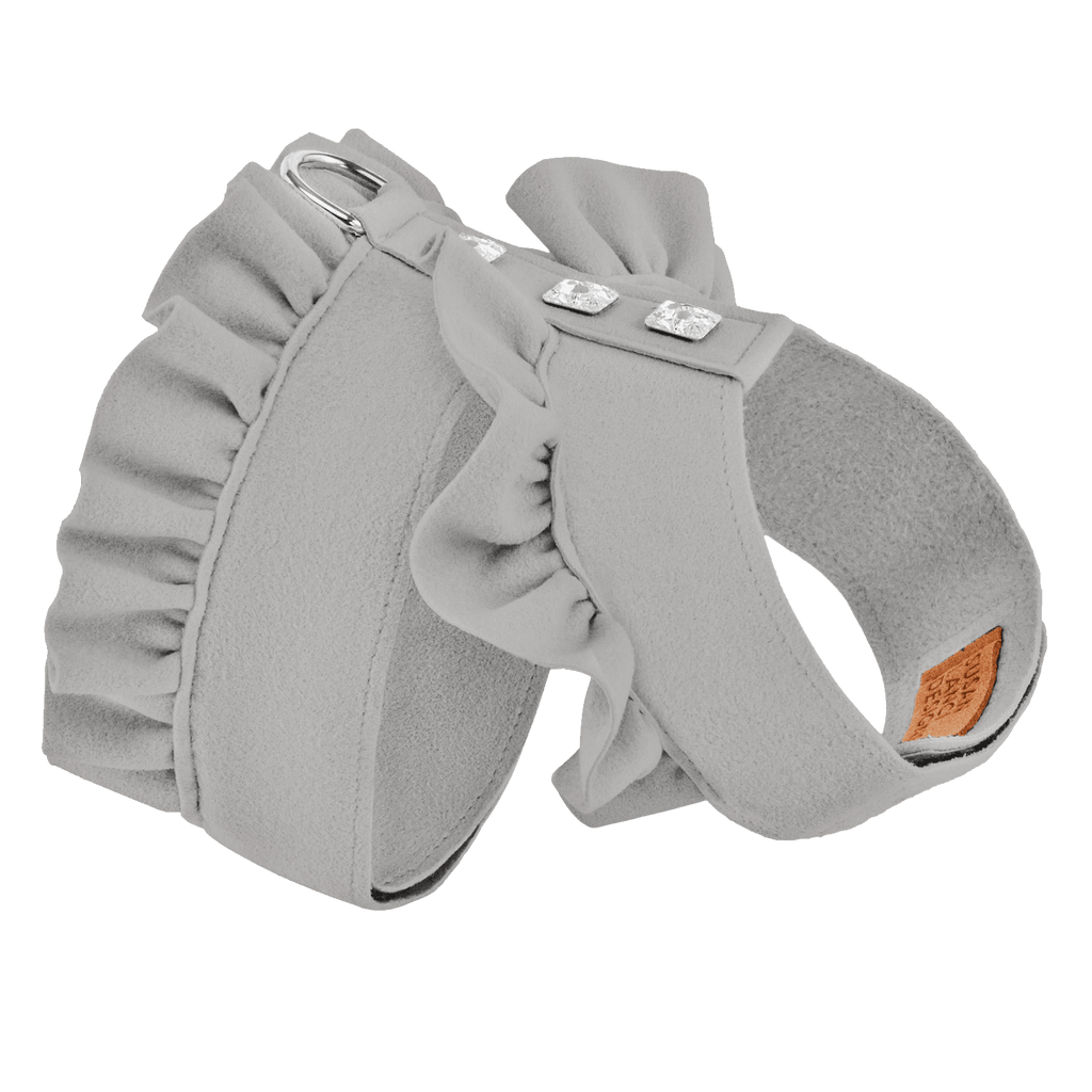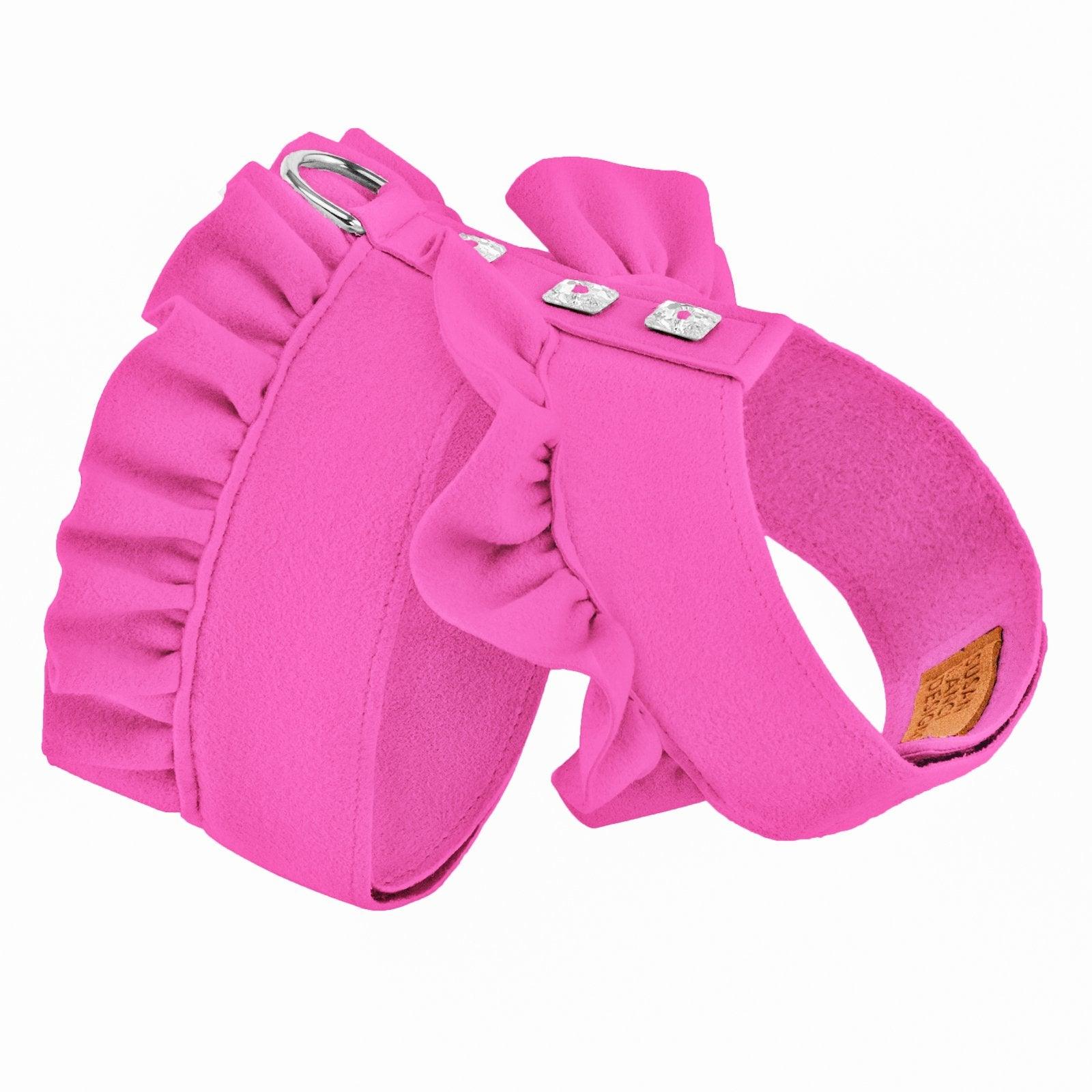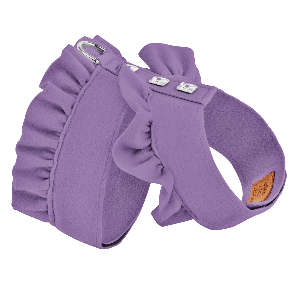This harness' elegant design offers a glamorous look while being comfortable for your dog and easy for you to maintain. Made from Ultrasuede® fabric with the soft texture and feel of premium suede. Ultrasuede® also has the highest grade of durability, making this harness resistant to stains and discoloration, it is even machine washable! Any pulling is across the shoulders and not the neck, resulting in pure comfort for your dog. Soft ruffles are further accented by sparkling Swarovski® crystal buttons. Hook-and-loop closures make for a no-fuss, secure fit. Manufactured in the USA