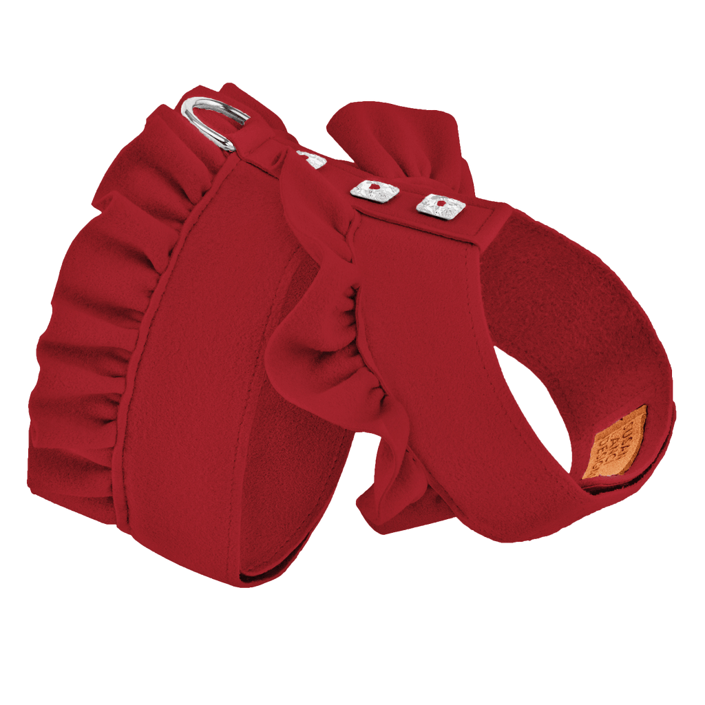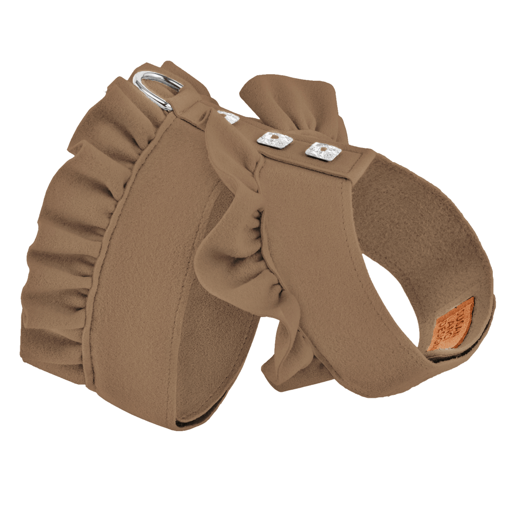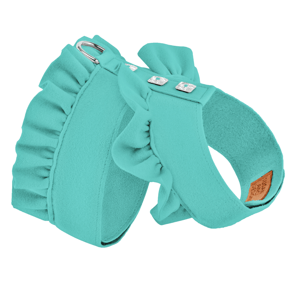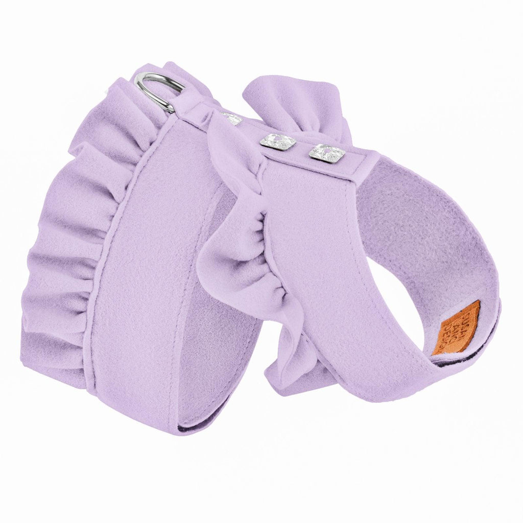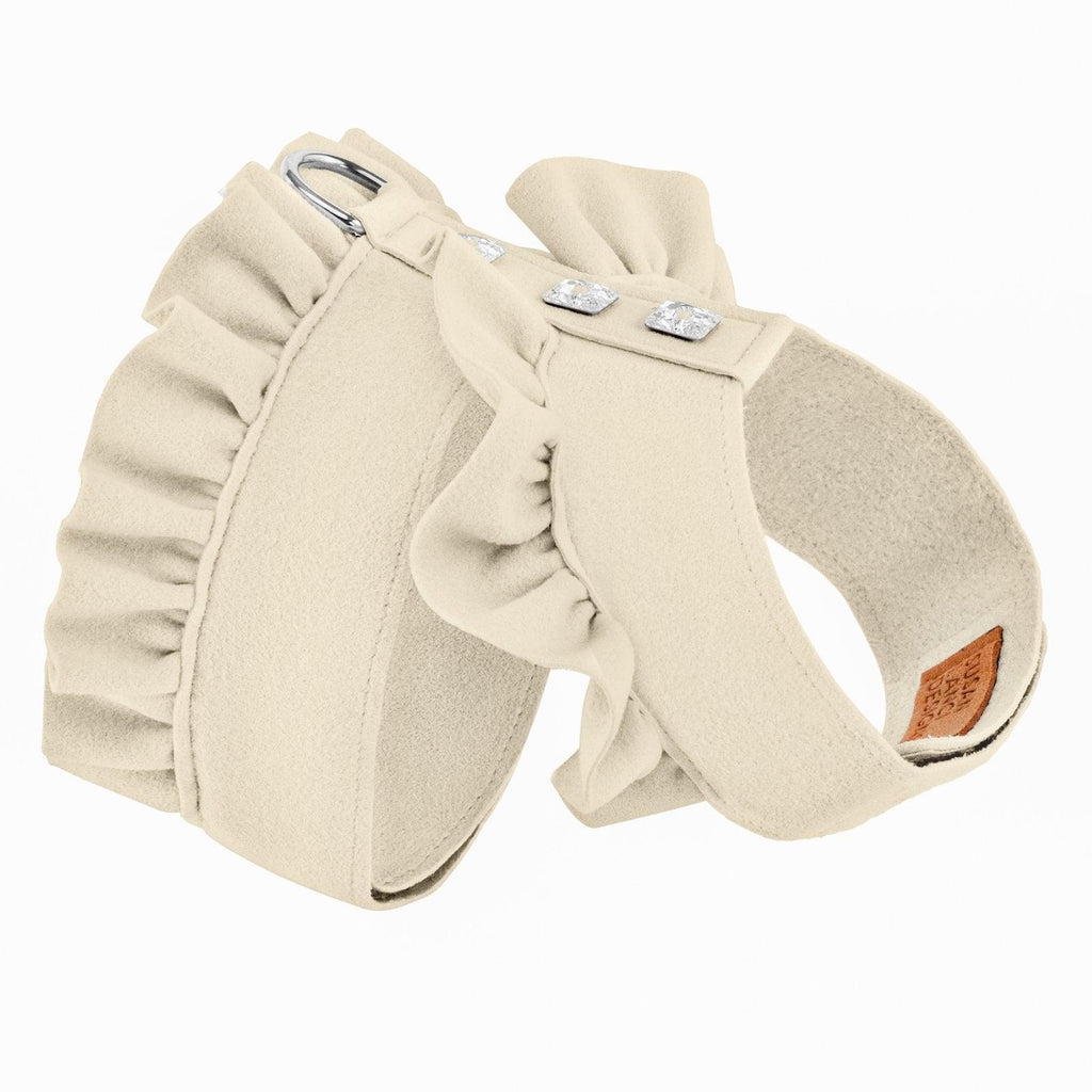 This harness' elegant design offers a glamorous look while being comfortable for your dog and easy for you to maintain. Made from Ultrasuede® fabric with the soft texture and feel of premium suede. Ultrasuede® also has the highest grade of durability, making this harness resistant to stains and discoloration, it is even machine washable! Any pulling is across the shoulders and not the neck, resulting in pure comfort for your dog. Soft ruffles are further accented by sparkling Swarovski® crystal buttons. Hook-and-loop closures make for a no-fuss, secure fit. Manufactured in the USA