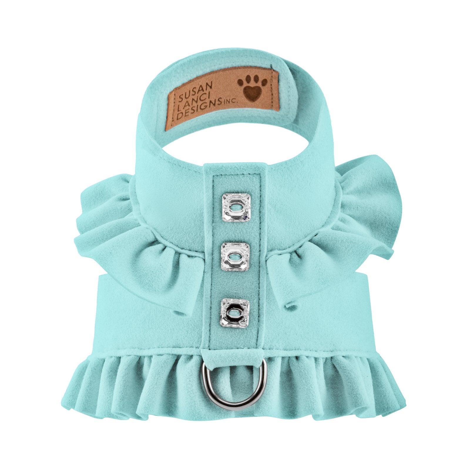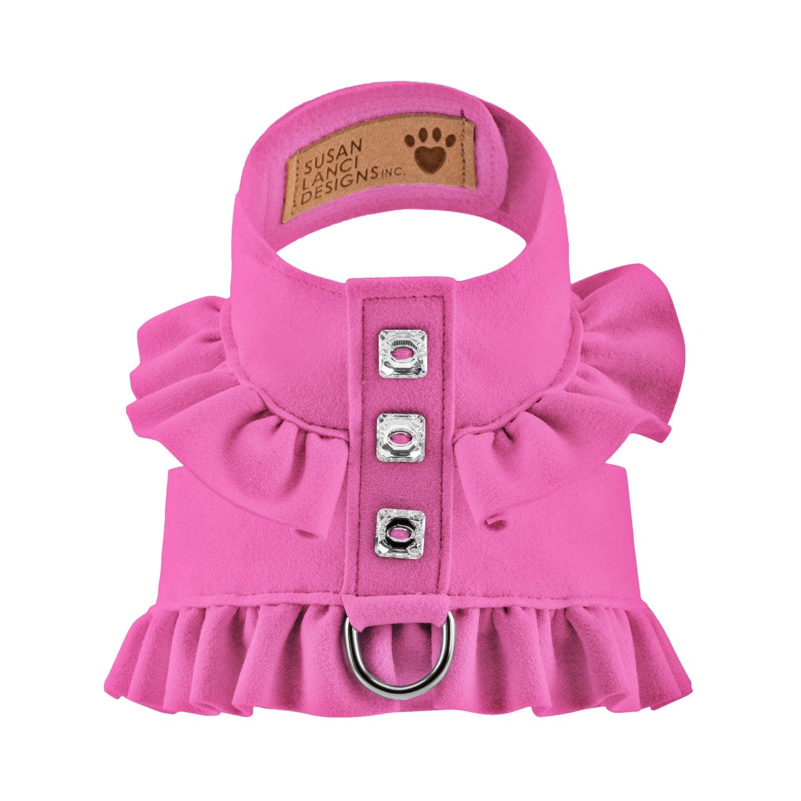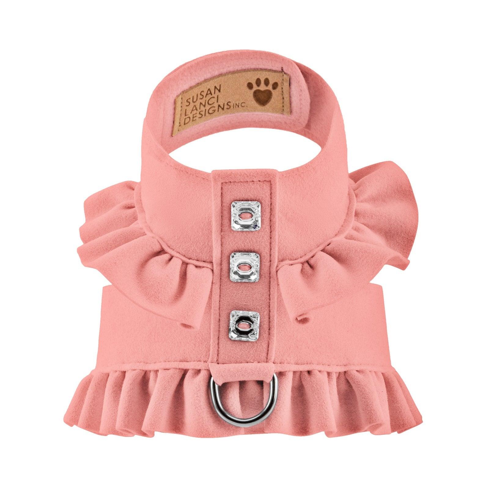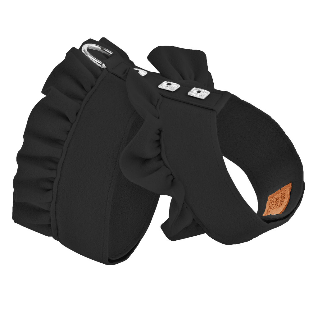This harness' elegant design offers a glamorous look while being comfortable for your dog and easy for you to maintain. Made from Ultrasuede® fabric with the soft texture and feel of premium suede. Ultrasuede® also has the highest grade of durability, making this harness resistant to stains and discoloration, it is even machine washable! Any pulling is across the shoulders and not the neck, resulting in pure comfort for your dog. Soft ruffles are further accented by sparkling Swarovski® crystal buttons. Hook-and-loop closures make for a no-fuss, secure fit. Manufactured in the USA