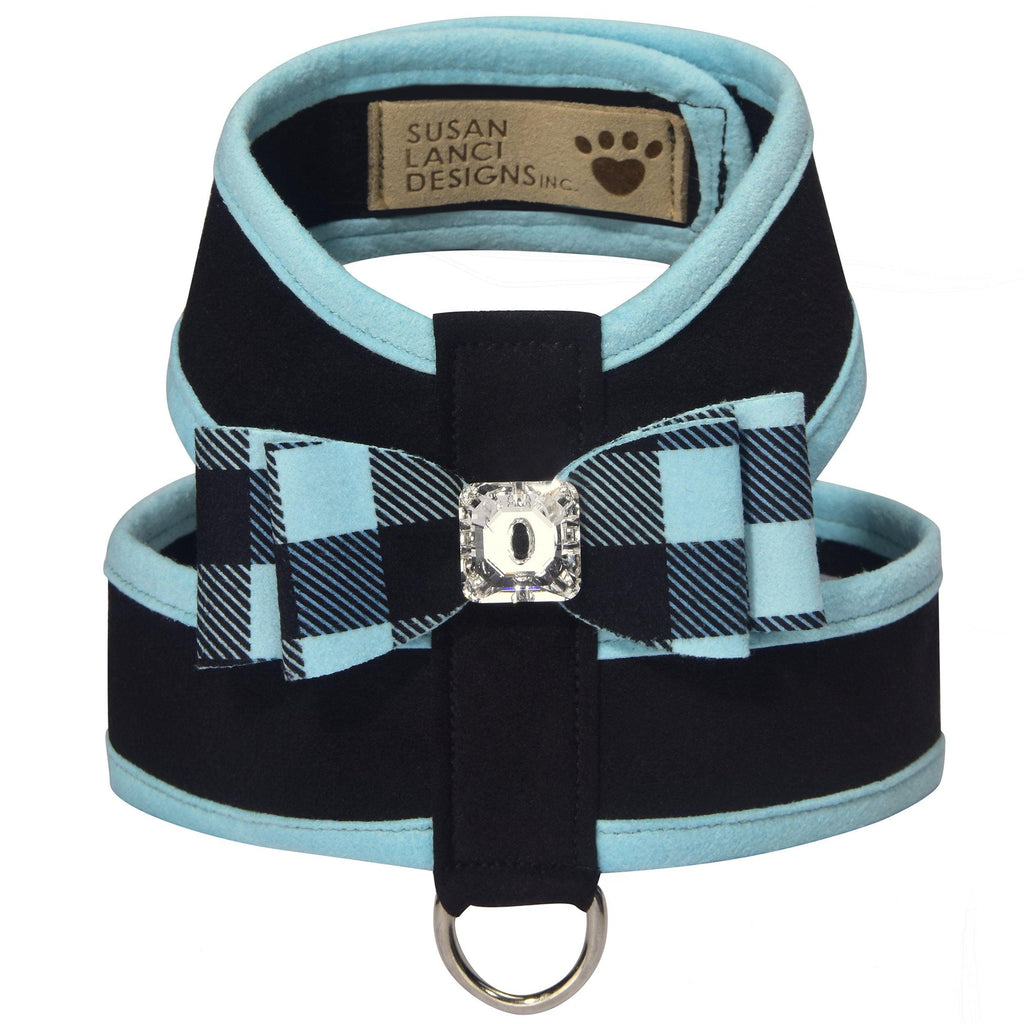 Smile! It's Gingham style. This harness' elegant design offers a glamorous look while being comfortable for your dog and easy for you to maintain. Made from Ultrasuede® fabric with the soft texture and feel of premium suede. Ultrasuede® also has the highest grade of durability, making this harness resistant to stains and discoloration, it is even machine washable! Any pulling is across the shoulders and not the neck, resulting in pure comfort for your dog. The Tiffi Gingham Big Bow is doubly darling with twice the bow to showcase a brilliant Swarovski® crystallized button. Hook-and-loop closures make for a no-fuss, secure fit. Manufactured in the USA.