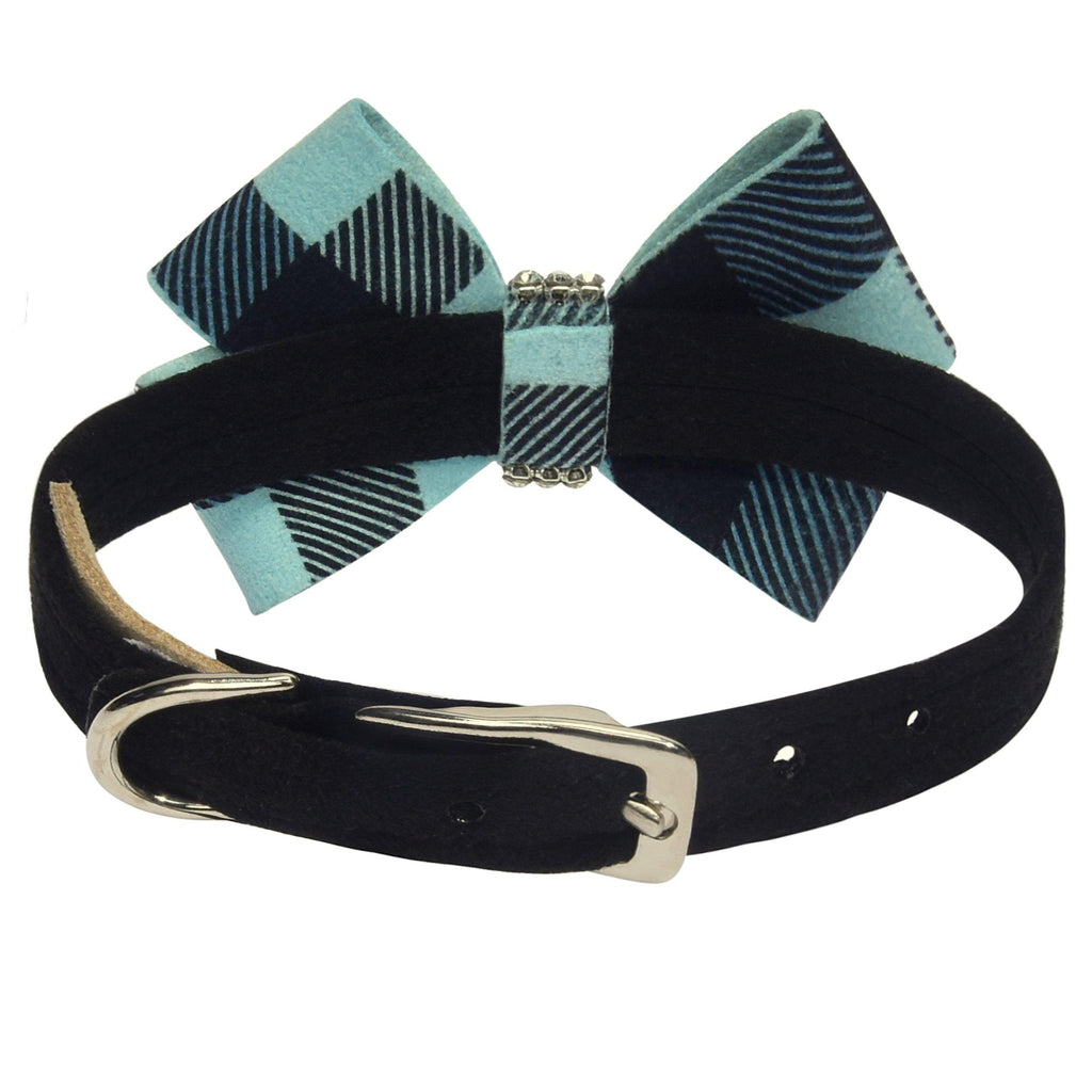 Smile! It’s Gingham style. This collar has a premium look and feel, while being easy for you to maintain. Made from Ultrasuede® fabric with the soft texture and feel of premium suede. Ultrasuede® offers the highest grade of durability, making this collar resistant to stains and discoloration, it is even machine washable! The Tiffi Gingham Nouveau bow captures all attention with bold curves embraced by rows of gleaming Swarovski Crystals®. We recommend your dog should always be walked with a harness. Our collars are designed for ID tags, charms and for decoration, they are NOT designed for pulling dogs. Collar width is ½”. Manufactured in the USA