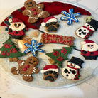 An assortment of adorable holiday-themed cookies, including Santa paws, snowmen, gingerbread pups, Christmas trees, snowflakes, and more — all beautifully decorated with dog-safe icing.